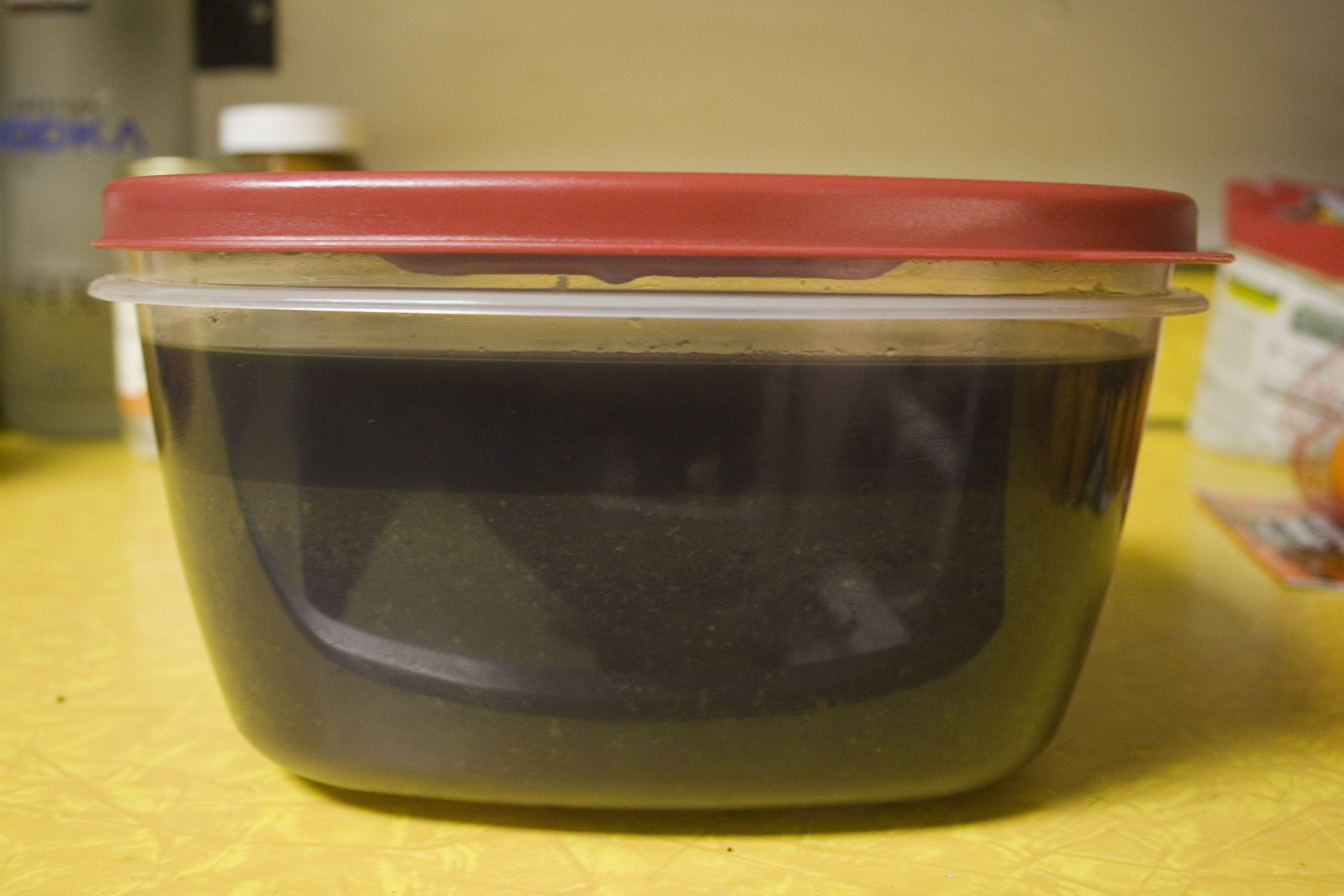 Step 4: Let the mixture cool off and put it through a metal strainer, letting the water and oil drip into a Tupperware container. After you use the strainer I would recommend squeezing out the additional oil with cheesecloth, or  at least press it through the metal strainer with a spoon. This is crucial as most of the oil will still be in the plant matter and needs to be squeezed out. Put it in the fridge overnight, NOT THE FREEZER!!